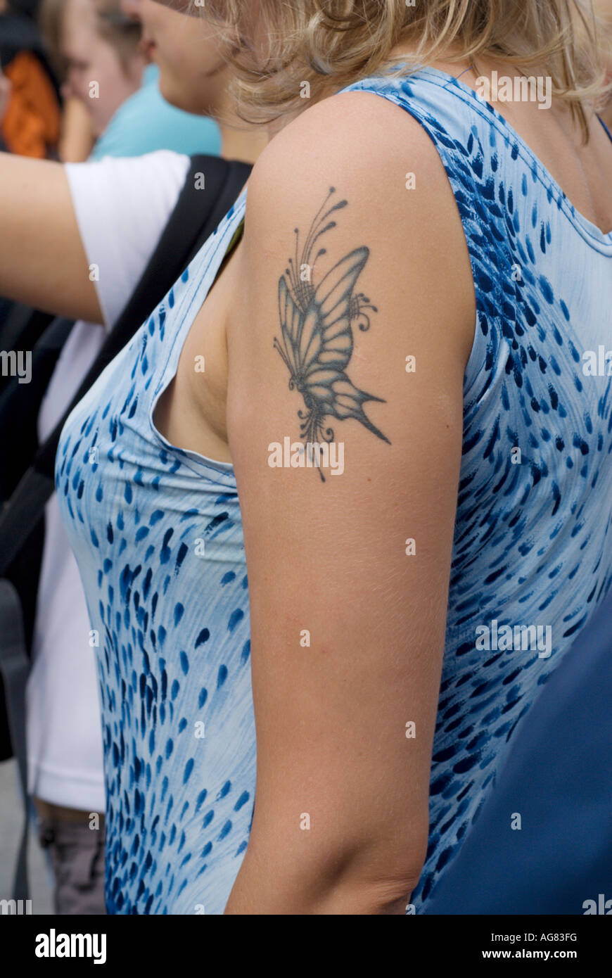 Detalle Mujer Con Vestido Azul Y Mariposas Tatuaje En El Brazo Fotografia De Stock Alamy